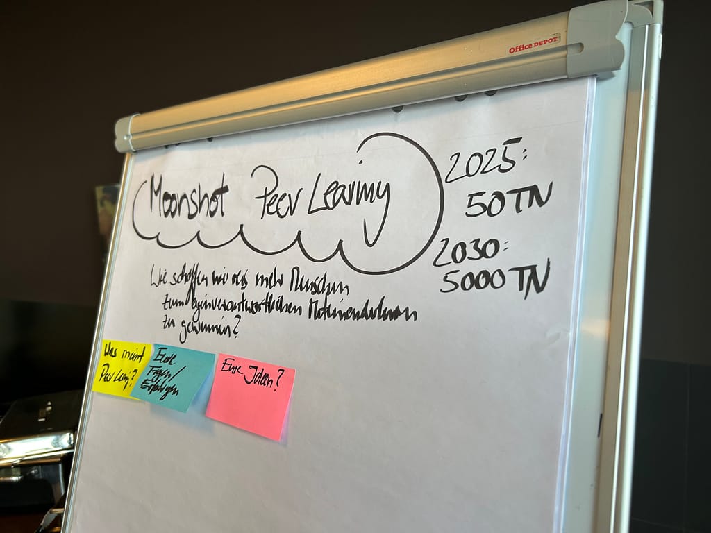 Um die Sache ‚groß‘ zu denken, habe ich die Session als ‚Moonshot Peer Learning‘ gepitched. In der Sessioneinleitung erläuterte ich mein Ziel, dass ich in fünf Jahren bei der Einladung in eine Learning Circle Experience statt 50 bereits 5000 Anmeldungen realisieren möchte. Think Big eben.
