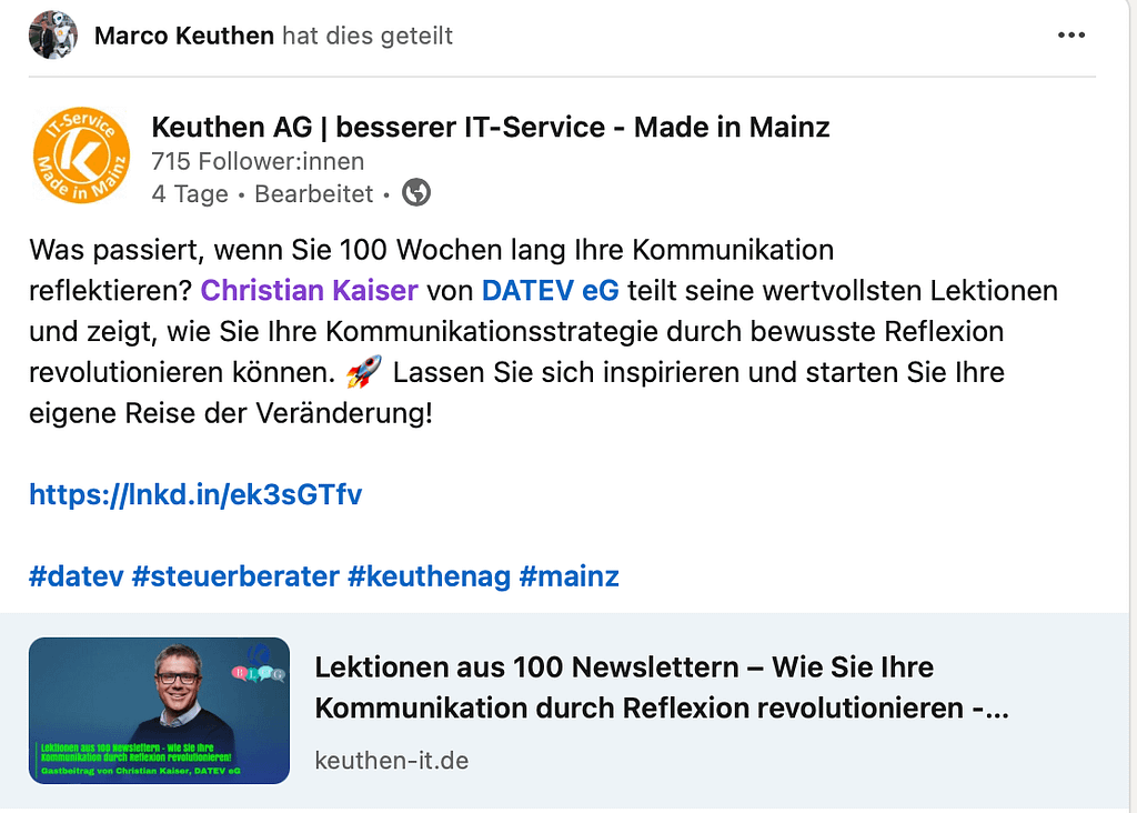 Was passiert, wenn Sie 100 Wochen lang Ihre Kommunikation reflektieren? Christian Kaiser von DATEV eG teilt seine wertvollsten Lektionen und zeigt, wie Sie Ihre Kommunikationsstrategie durch bewusste Reflexion revolutionieren können. 🚀 Lassen Sie sich inspirieren und starten Sie Ihre eigene Reise der Veränderung!
