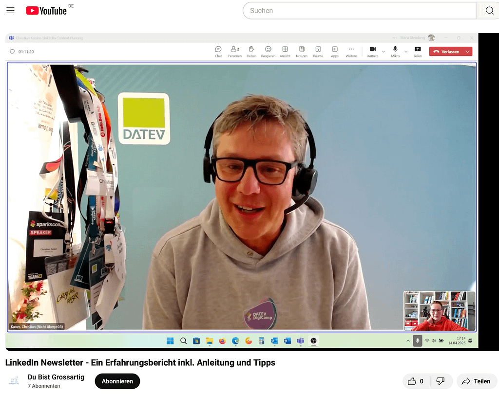 „Deine Antwort und Lösung ist sehr spannend Christian Kaiser. Aufgrund meines fehlenden LinkedIn und Newsletter Vorwissens habe ich allerdings gerade einen Information Overload. Hast Du Lust ein How To Video mit mir zu erstellen? Dafür machen wir nen ganz normales Teams Meeting und zeichnen das auf. Im Meeting erklärst Du mir was Du machst und Ich stelle Verständnisfrage. Das Video veröffentlichen wir anschließend, damit die Anleitung für alle sichtbar ist und ich immer mal wieder nachschlagen kann, wenn ich einen Schritt vergessen habe. Wo wir das veröffentlichen ist mir egal. Ich könnte es auf meinem Youtube channel https://m.youtube.com/channel/UC2g9EdY6AzAEqFOrXjMIM7A hochladen. Dann ist es für alle greifbar, die Internet haben.